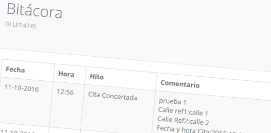 - Bitácoras de registro de gestiones que muestran los distintos movimientos y estados de avance tanto en terreno como en backoffice